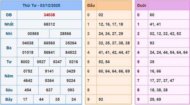 Bảng kết quả xsmb ngày 03/11/2025