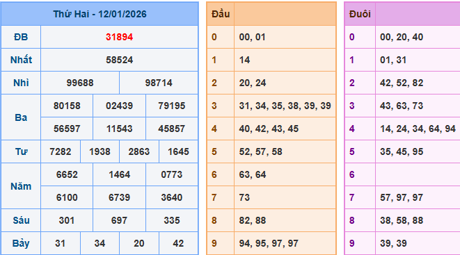 Bảng kết quả xsmb ngày 12/01/2026